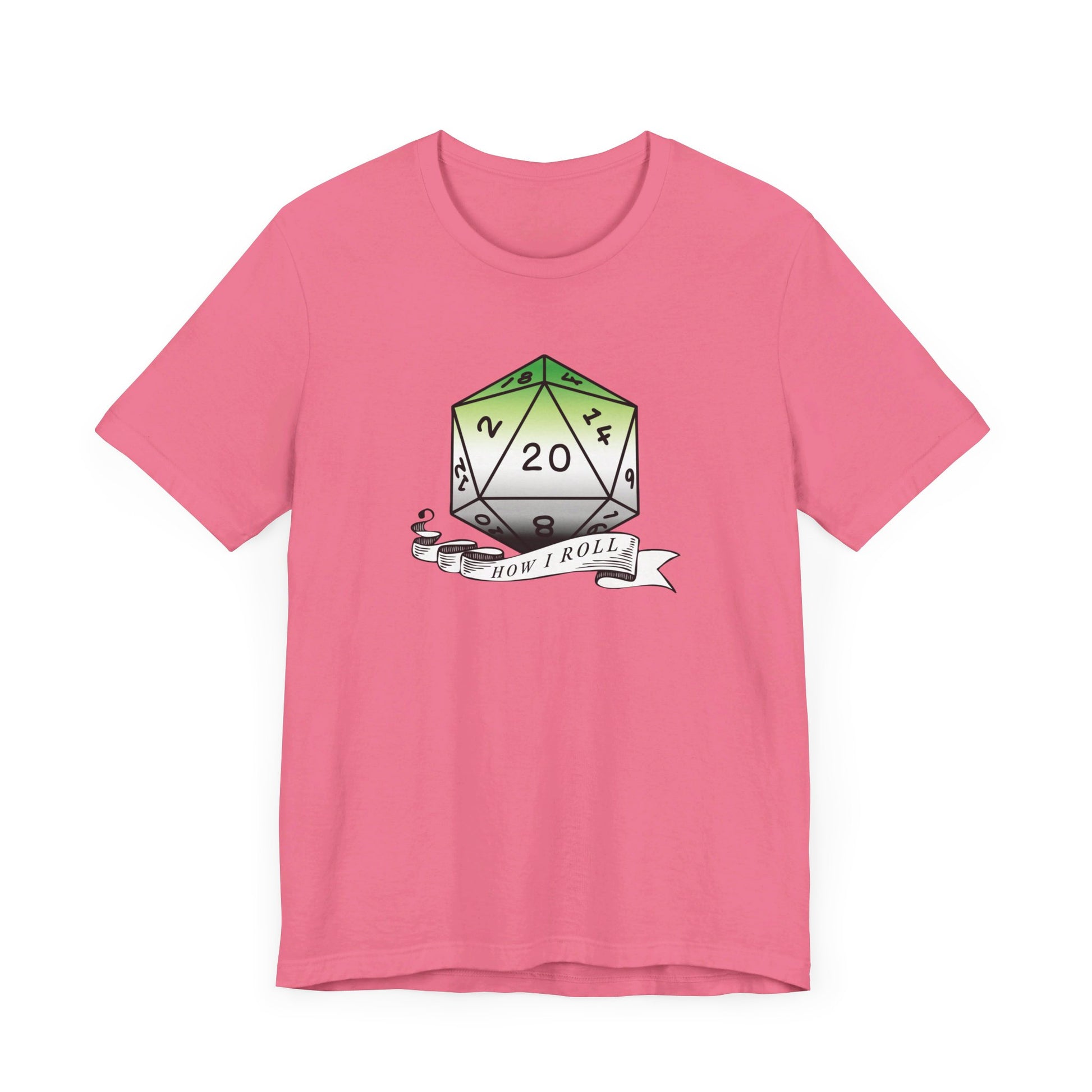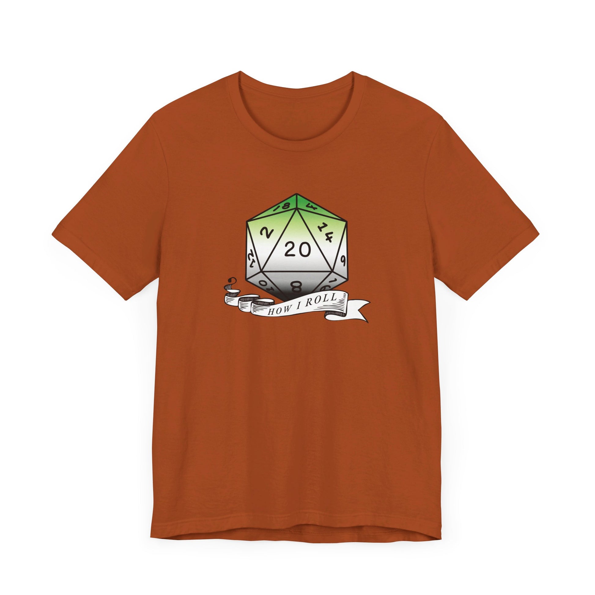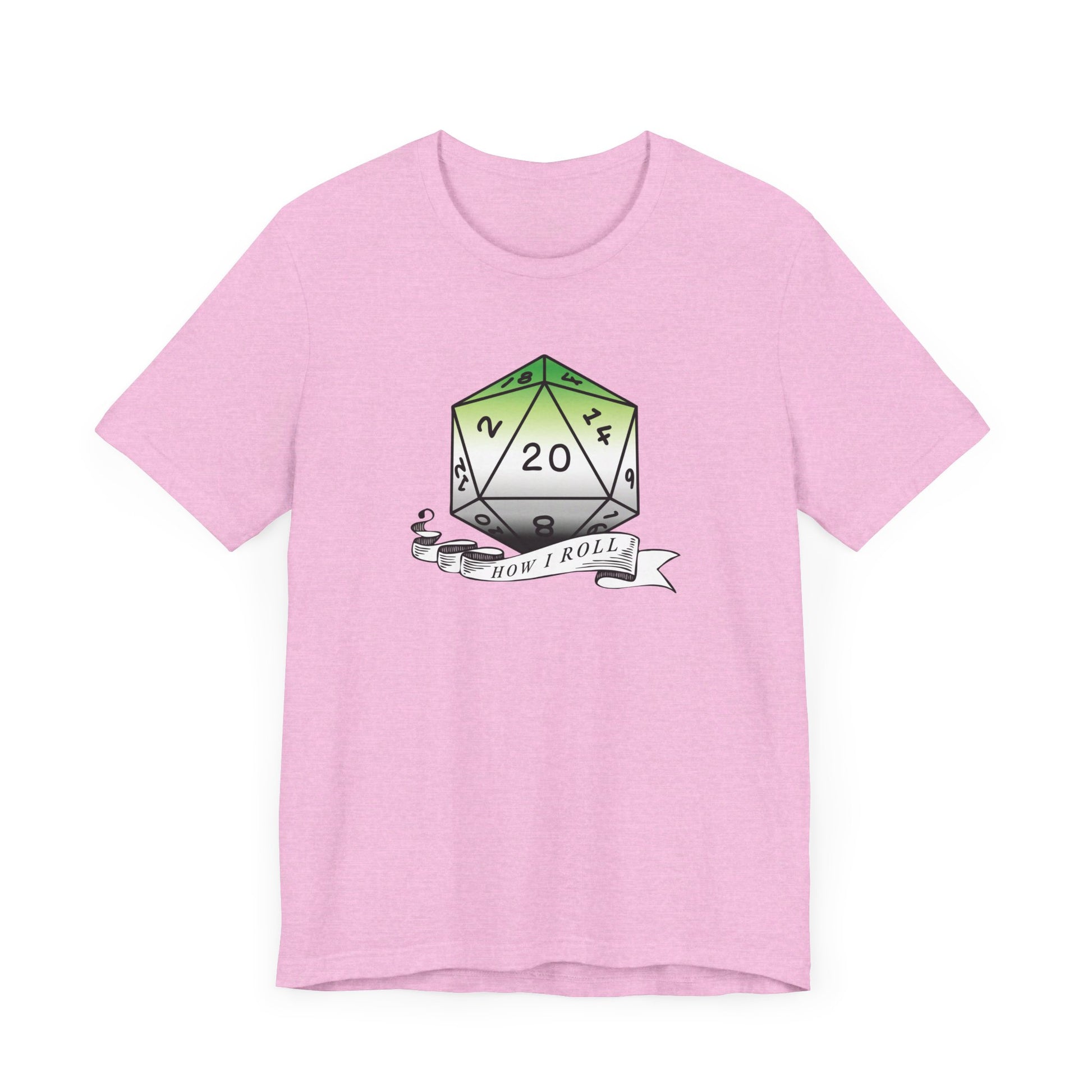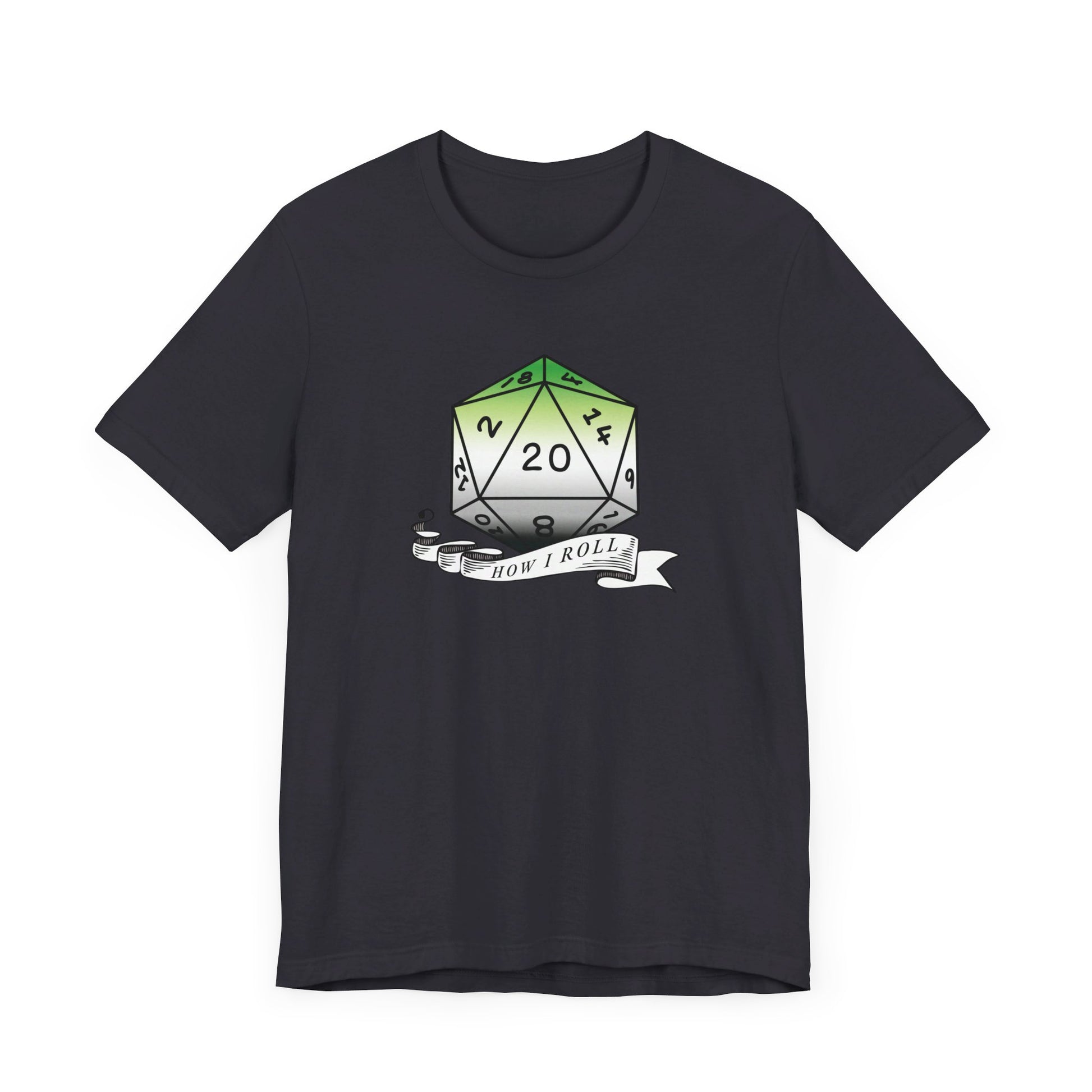 This shirt features a bold, 20-sided die (D20) splashed with the vibrant colors of the Aromantic Pride flag. Below the D20, the design is finished off with the message: "This is How I Roll."