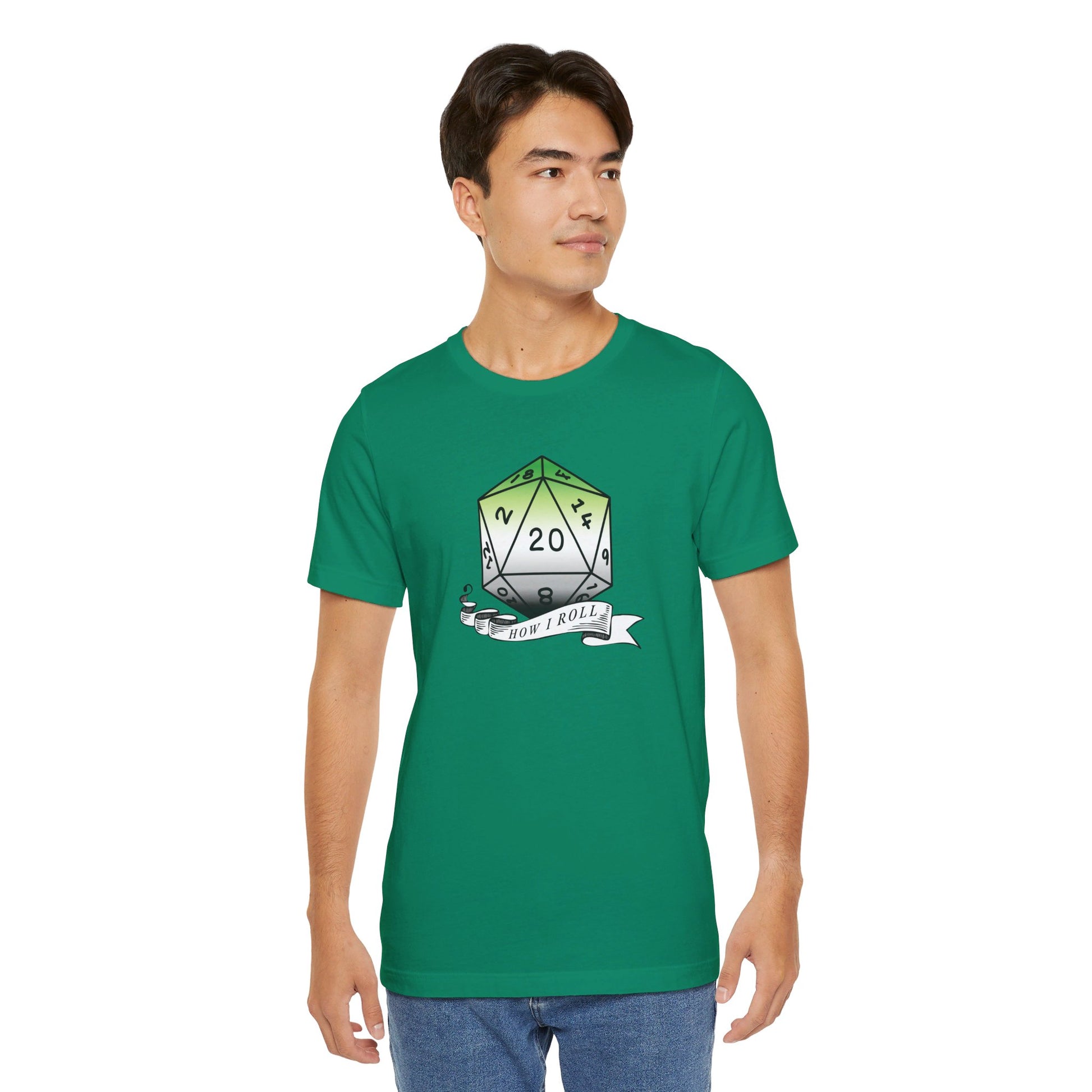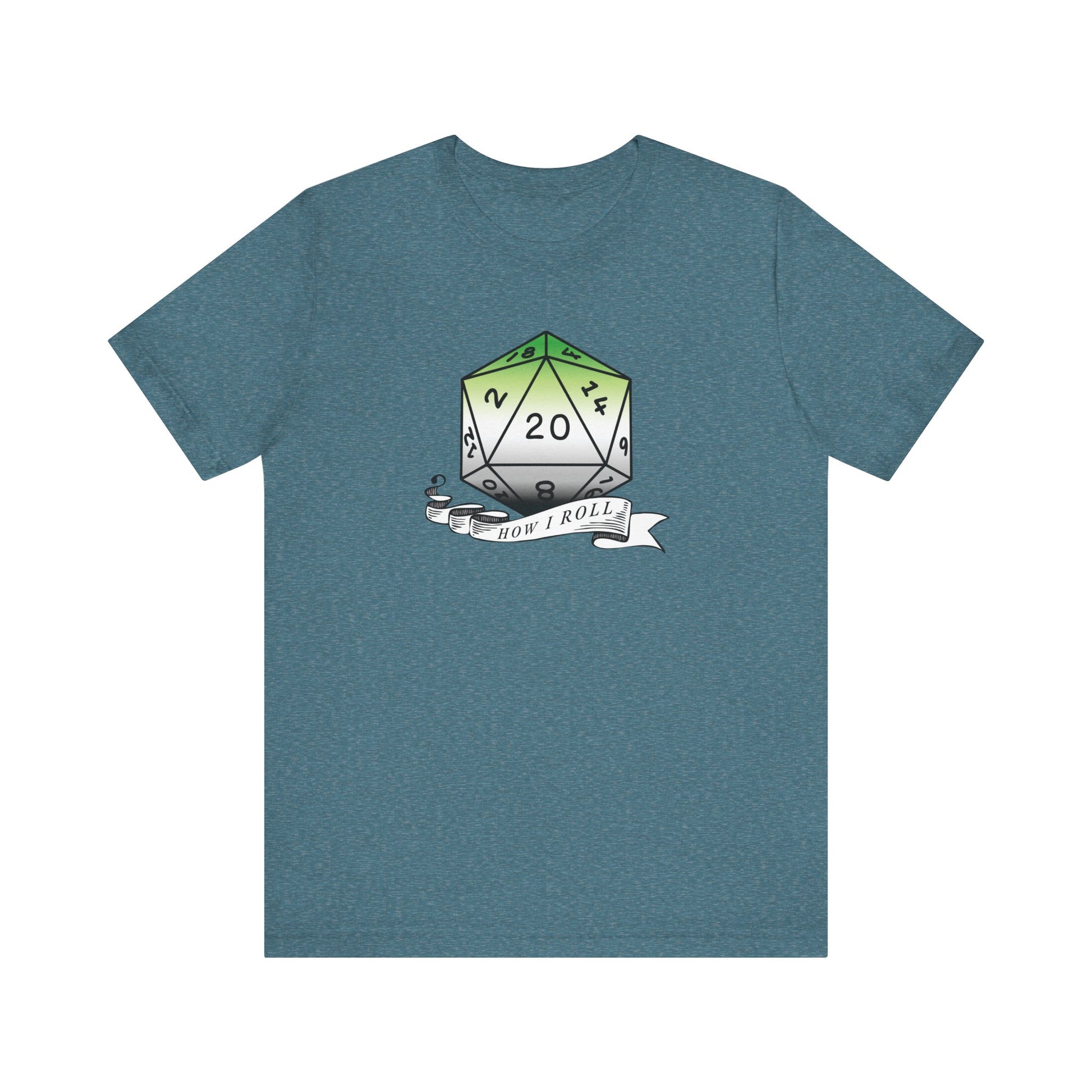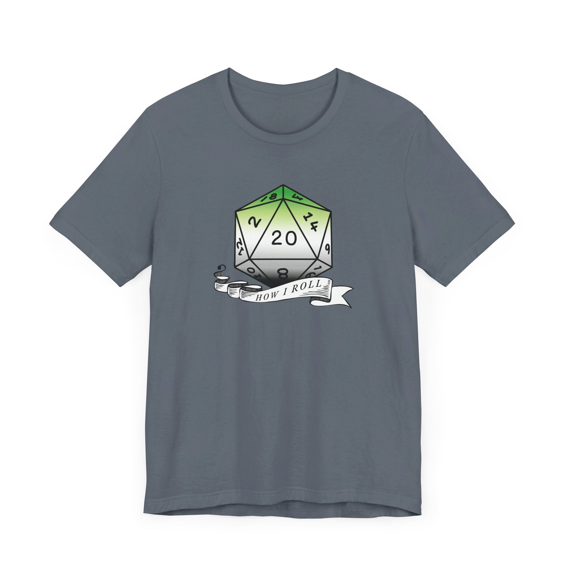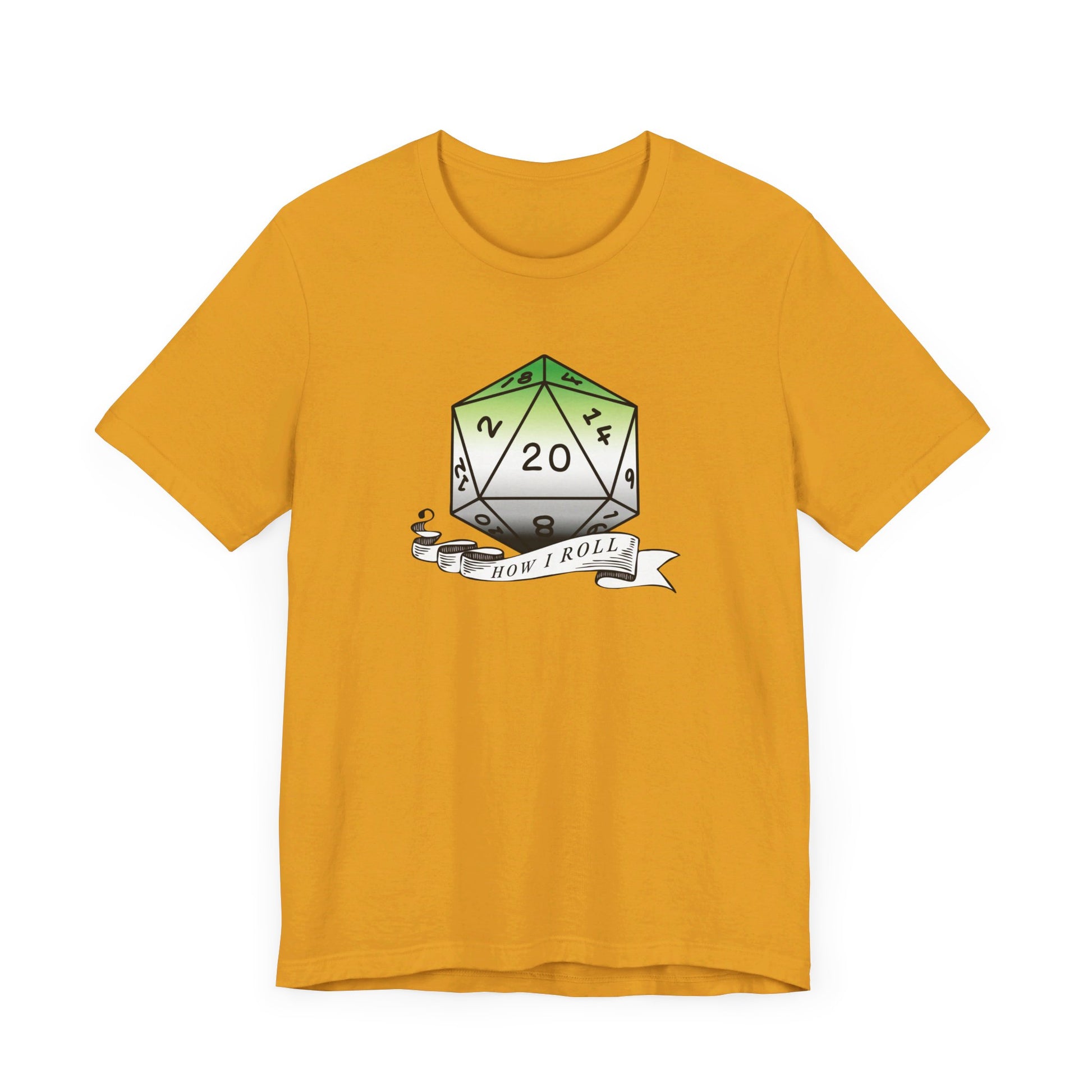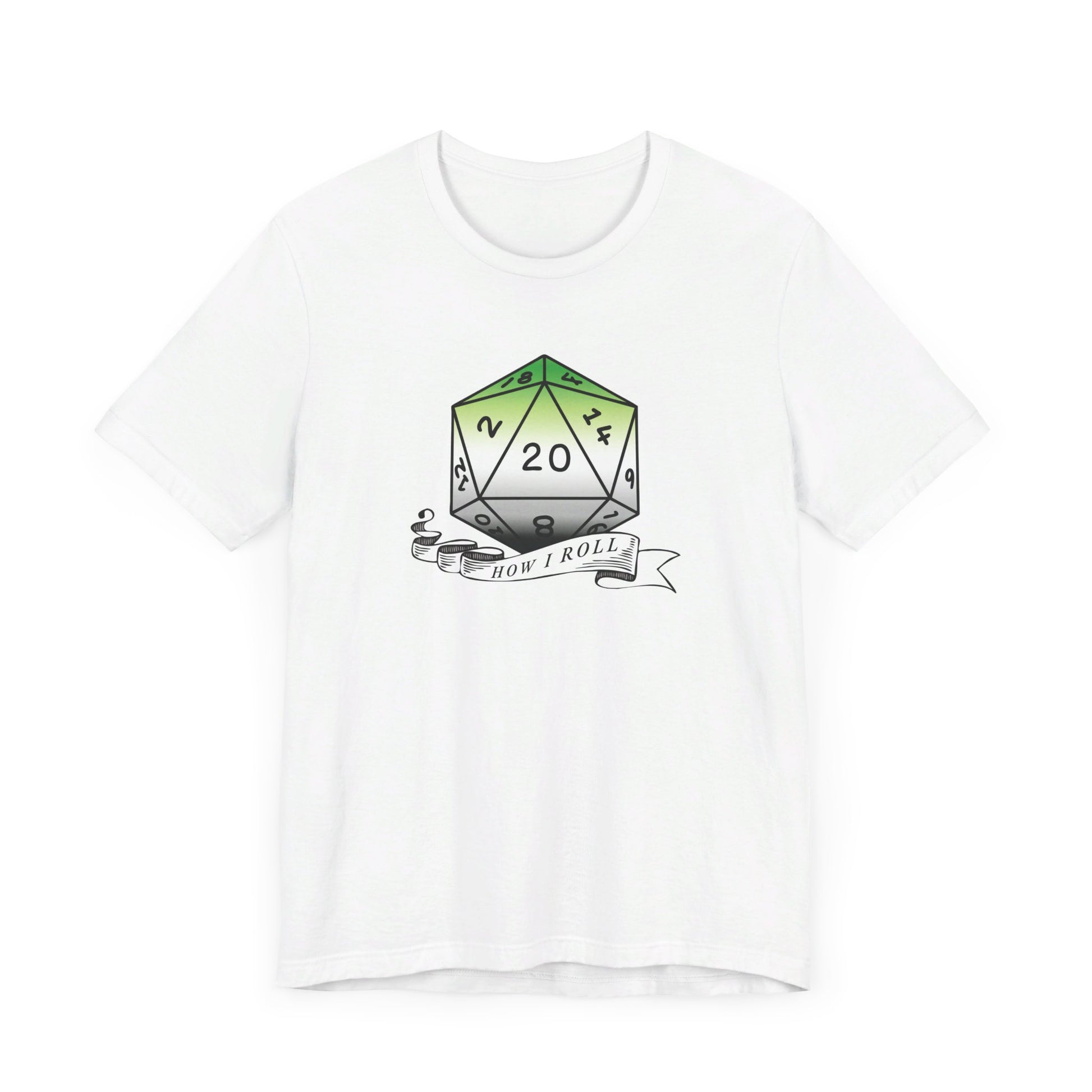This shirt features a bold, 20-sided die (D20) splashed with the vibrant colors of the Aromantic Pride flag. Below the D20, the design is finished off with the message: "This is How I Roll."