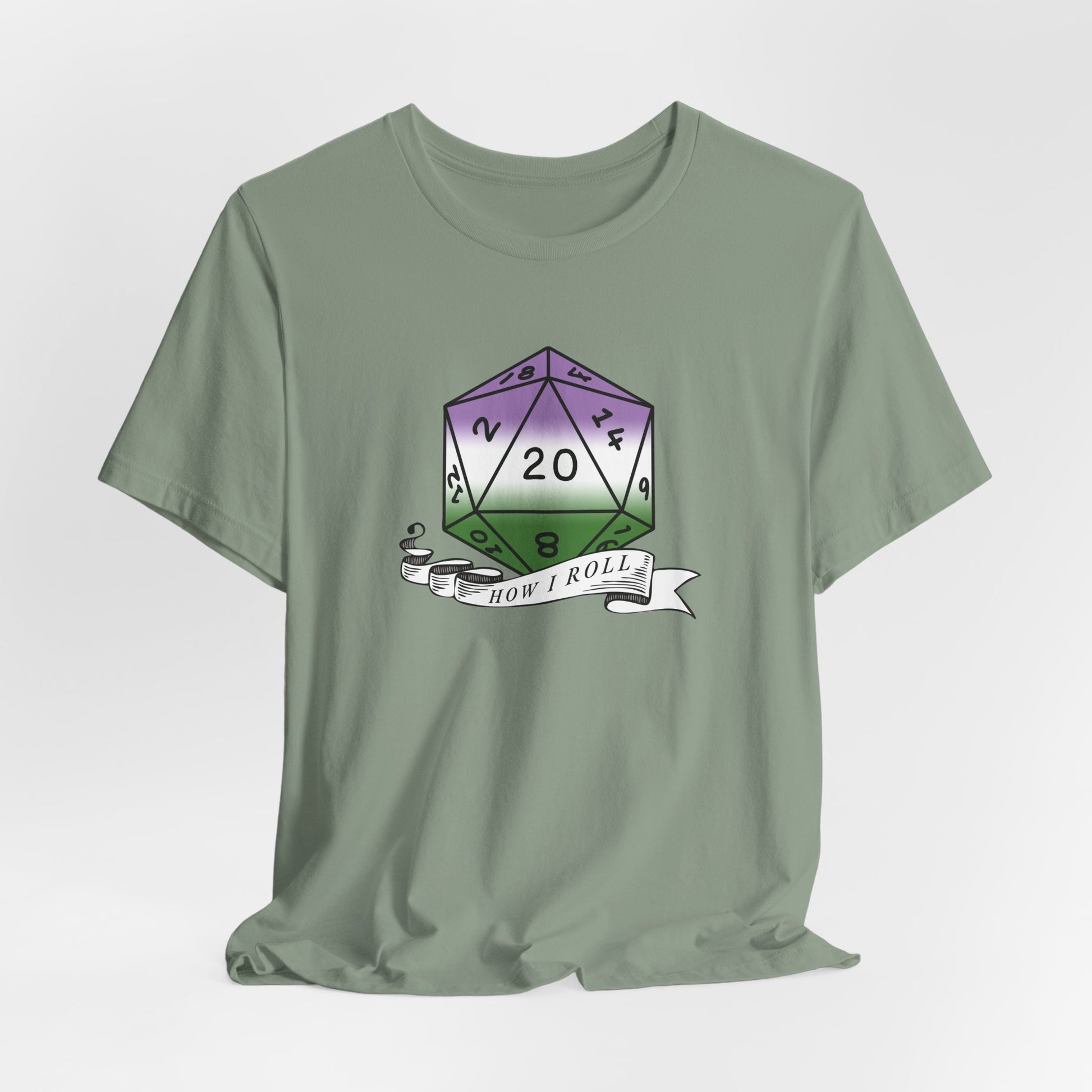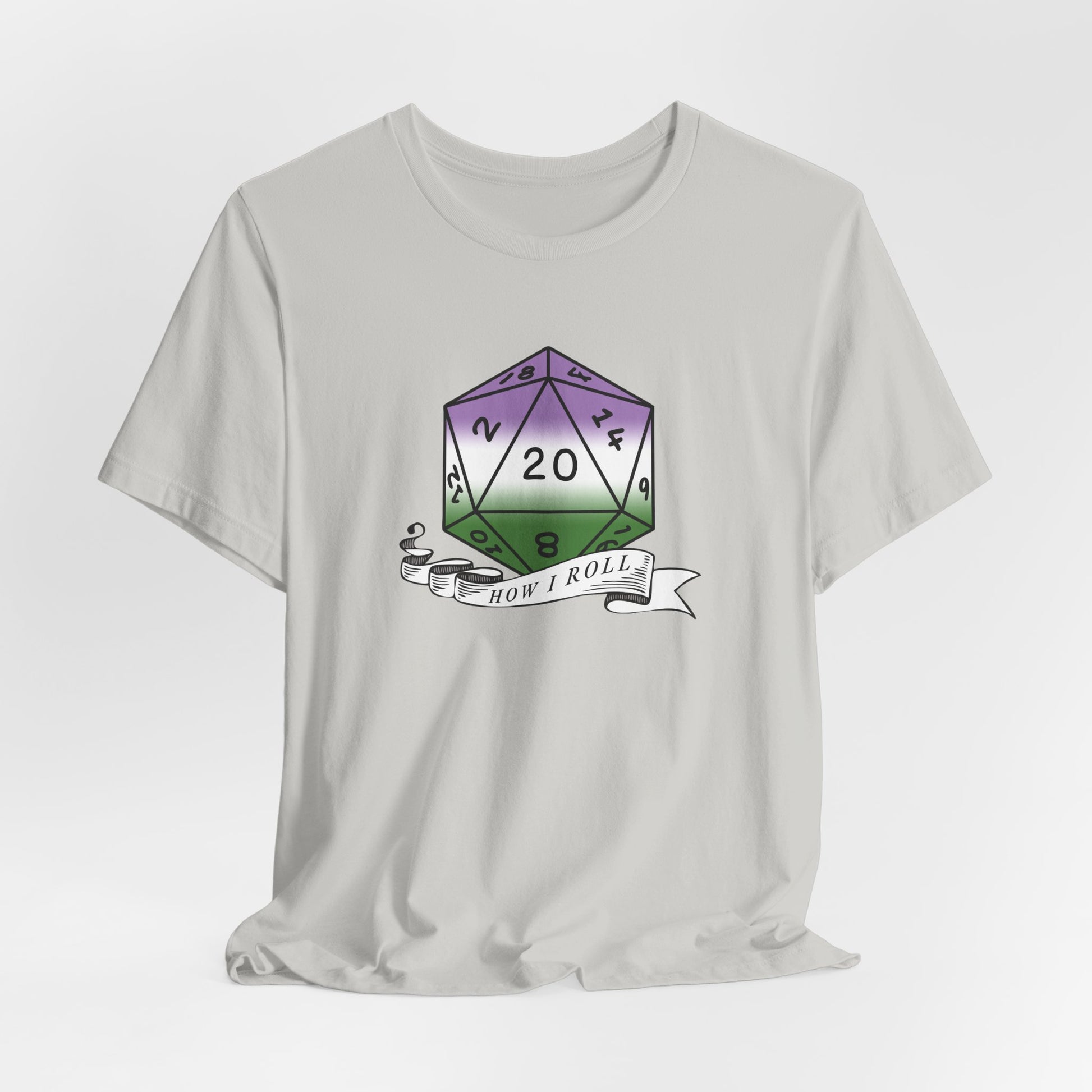 This shirt features a bold, 20-sided die (D20) splashed with the vibrant colors of the Genderqueer Pride flag. Below the D20, the design is finished off with the message: "This is How I Roll."